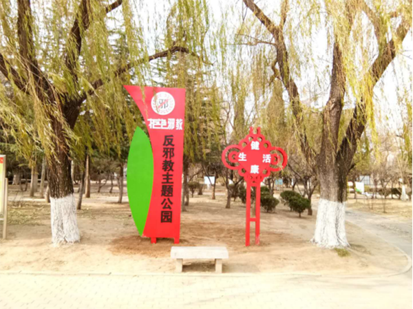 建立反邪教主题公园。选点市内一些群众休闲娱乐活动比较集中的公园、街心花园等地址,建成多处反邪教主题公园,通过放置宣传栏、悬挂宣传标语形式,配上内容丰富的文字讲解、图片说明,方便周边群众在日常休闲娱乐活动中就可以接受到识邪、防邪的知识,增强自觉抵御邪教侵蚀的能力。