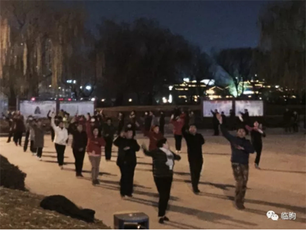 夜晚来临,群众来到临朐县反邪教主题公园健身休闲