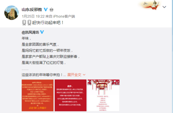 春节临近,山东省潍坊市立足基层实际,组织开展丰富多采的反邪教宣传活动,将防邪教、识邪教的自觉意识巧妙融入居民群众日常生活中,倡导市民争过一个文明、无邪的新春佳节。