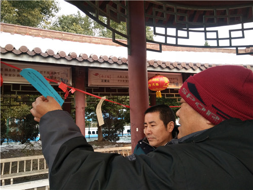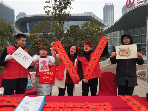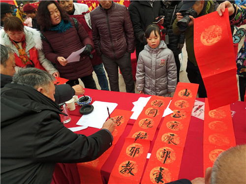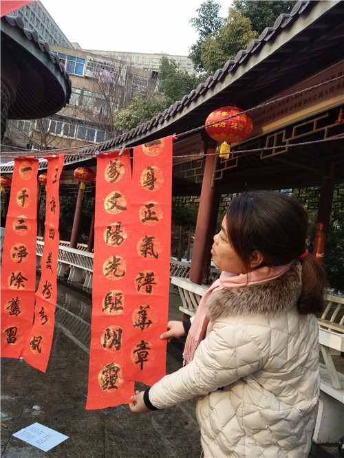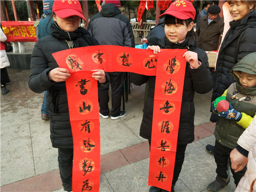 活动的另一边是社区邀请的辖区知名书法家岳庭富等几位书法爱好者在现场挥毫泼墨,为群众送上一份份新年的祝福。“万丈阳光驱阴霾、一身正气谱华章”、“崇尚科学创文明、反对邪教齐努力”等反邪教对联也广受市民的欢迎。