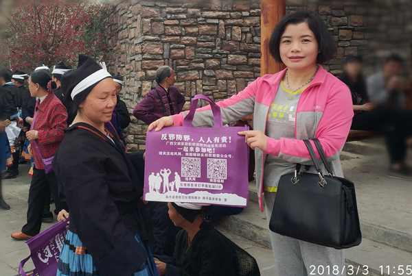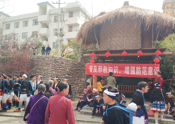 当天,来自南丹县里湖瑶族乡、八圩瑶族乡和贵州省荔波县瑶山乡及广西河池市金城江区侧岭乡的一万多名白裤瑶同胞穿着民族盛装欢聚“中国白裤瑶之乡”南丹县里湖瑶族乡,与慕名前来的上万多名各族群众开展丰富的活动,共庆佳节。南丹县防范办结合白裤瑶的生活习俗和年街会的特点特色,充分利用这一少数民族大聚会契机,精心制作反邪教宣传品、反邪教宣传资料,携手该县民族宗教局深入年街会现场悬挂反邪教横幅,摆放反邪教宣传图画,设固定宣传咨询服务点和流动发放反邪教宣传品、宣传资料并实地实时答疑,动静结合地开展反邪教宣传活动,得到了白裤瑶同胞和群众的开心欢迎和积极响应。活动现场共发放宣传资料和宣传品10000多份,引导手机扫码网络签名反邪教2000人次,解答咨询3000人次,有效地提高了广大瑶族群众对邪教和宗教的认识,从而增强防范邪教危害和宗教渗透能力,促进民族团结、安居乐业、和谐发展和社会稳定。