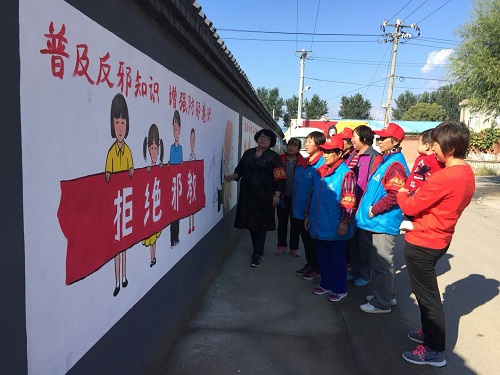 昌平区为了让“远离邪教、拒绝邪教”的理念深入人心,借环境整治,在百善镇推出反邪教文化墙。 “拒绝邪教”、“普及反邪知识,增强防邪意识”……一幅幅生动传神的宣传画、一句句富含哲理的谚语、一条条通俗明白的政策解读,成为百善镇的新景观,被村民誉为“会说话的墙”。文化墙成为一块块生动的反邪教文化宣传阵地,潜移默化地影响了村民,提升了村民的文化素质,做“活”了反邪教文化内容,育实了文明的乡风,吸引了村民们的热情参与,形成了“人人争当反邪志愿者,户户争做文明新农户”的浓厚氛围。