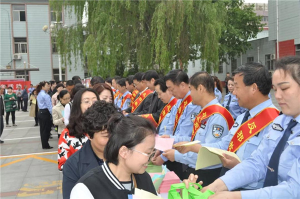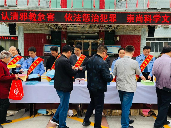 活动现场,工作人员向干部群众发放反邪教宣传资料。