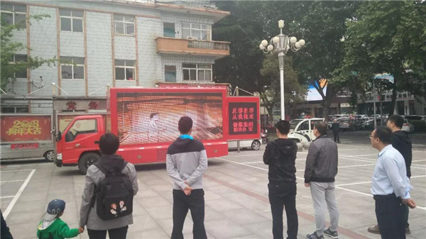 群众驻足观看宣传车上播放的反邪教题材类微动漫。