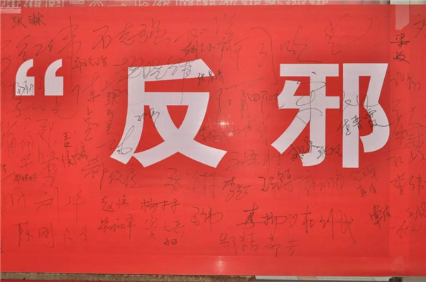 签满反邪教志愿者名字的条幅。