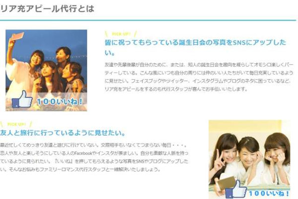 一家提供“朋友租赁”服务的日本网站截图。图上文字大意为“想要拍大家一起过生日、一起玩耍的照片上传网络的人,可用此服务”。