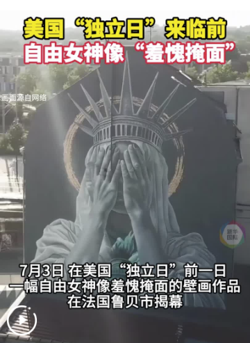 7月3日,在美国“独立日”到来前一日,一幅自由女神像羞愧掩面的壁画作品在法国鲁贝市揭幕。