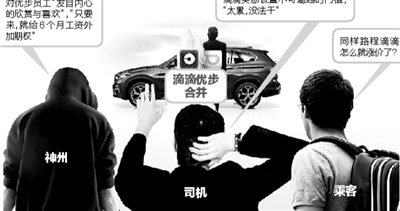 目前,优步团队拥有800名员工,两家合并后,优步中国也用延期兑换期权的方式对员工进行挽留。一名优步员工对北青报记者表示,优步作为一家跨国公司,文化与滴滴几乎完全不同,自己担心在合并后会不会快速融入到滴滴公司中去。与这位员工类似,这几日在优步的团队内部一直有一种较为悲观的情绪,一名优步的员工表示自己“很心痛”,还有的表示“不知是无奈还是伤感”。一篇名为“生而骄傲:uber的那些年轻人”的文章在优步团队中广为分享,其中写道“滴滴那么牛,但我不在乎啊,我是优步的死忠”。