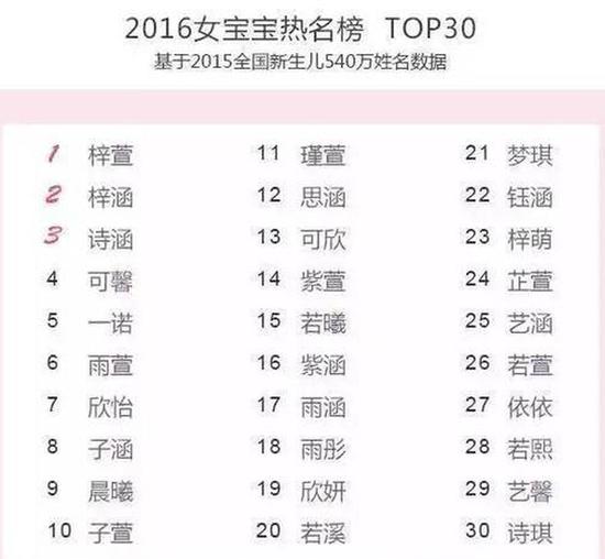 中国人的名字有什么特点?近日,国内首份姓名大数据报告显示,2016男宝宝女宝宝热名榜前三分别为:浩然、子轩、皓轩;梓萱、梓涵、诗涵。