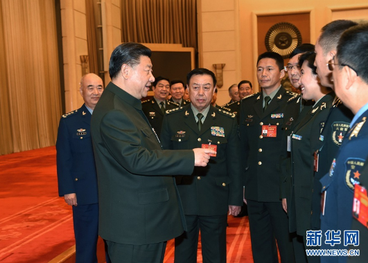 3月12日,中共中央总书记、国家主席、中央军委主席习近平出席十二届全国人大五次会议解放军代表团全体会议并发表重要讲话。这是会议结束时,习近平亲切接见来自基层部队的部分军队人大代表。新华社记者 李刚 摄