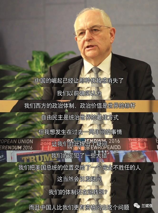 “我们曾经认为我们西方的政治体制、政治价值是世界的标杆,自由民主是统治世界的最佳方式,但我想发生在过去一两年间的事情,让我们对此也提出了疑问。我们肯定犯了一些大错,才会把美国总统的位置交给了一个完全不胜任的人。这当然会引发疑问:我们的体制还在运转吗?而且中国人比我们更有资格问出这个问题。 西方的确应该自问,我们是否还有自信的资本。”