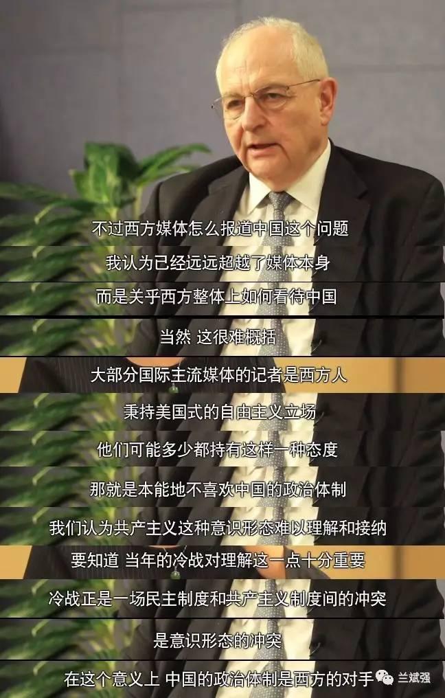 “我们认为共产主义这种意识形态难以理解和接纳。要知道,当年的冷战,正是一场民主制度和共产主义制度间的冲突,是意识形态的冲突。在这个意义上,中国的政治体制是西方的对手,人们当然对它有所怀疑。”