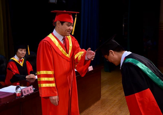 6月14日,河南农业大学举行2017年毕业典礼暨学位授予仪式,图为中国工程院院士、河南农大校长张改平为毕业生拨穗。周红飞/摄