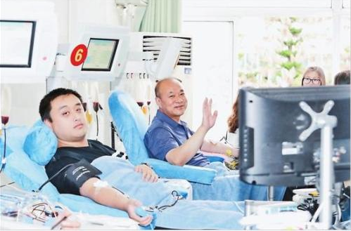 鲜红的血液,从吕林父子俩手臂里缓缓流出,进入血液成分分离机。机器上挂着3包血袋,一包红色全血,一包半透明的是分离出来的血小板,还有一包是待会输回到体内的其他血液成分。