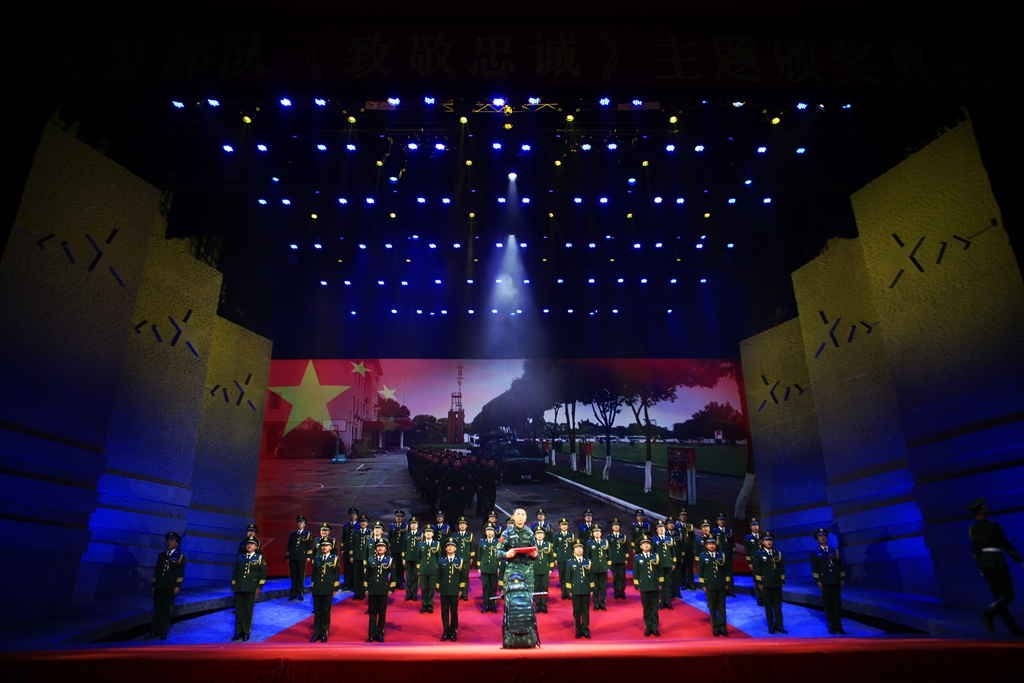 人民网北京8月1日电(倪光辉、何媛)武警部队“致敬忠诚”主题颁奖典礼日前在北京国安剧院隆重举行。来自武警陕西省总队的郑明岗等10名官兵被表彰为第21届“中国武警十大忠诚卫士”,他们是(以姓氏笔画排序):王占军、韦汉忠、刘琳、刘腾飞、孙雯、周道群、郑明岗、徐波、彭星、戴诗雄。;来自武警新疆总队的朱博伟等10名士官和张小红等10名军嫂分别受到“武警部队十大标兵士官”和“武警部队十佳军嫂”表彰。