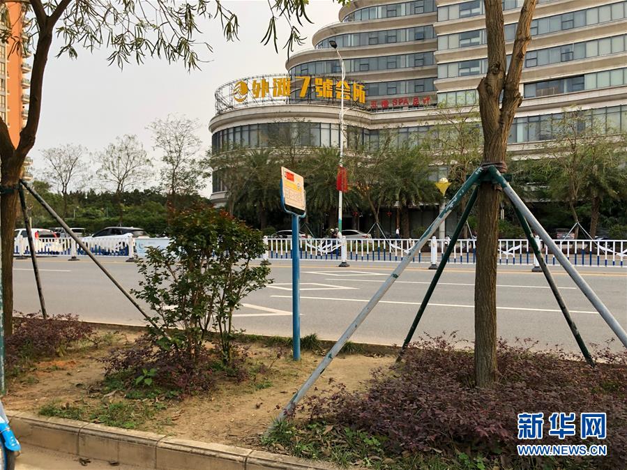 北海一处绿化带中的公交站牌(3月21日摄)。新华社记者 潘强 摄