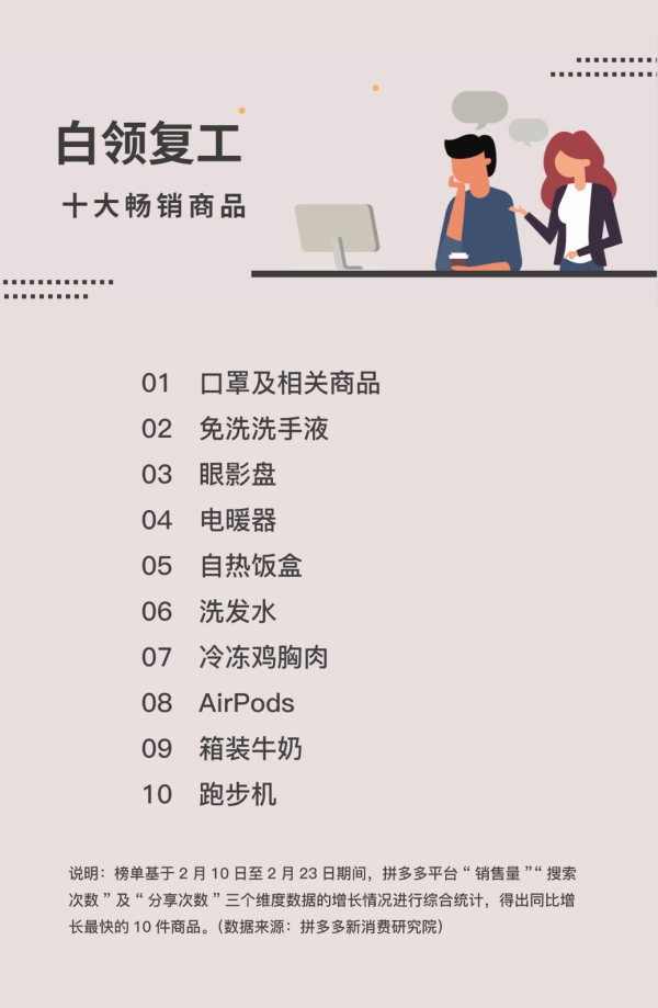 日前,拼多多对平台消费数据尤其是三线以上复工密集城市的消费数据进行了分析,得出“白领复工10大热销商品”榜单。其中,既有口罩及相关衍生品,又有自热饭盒、眼影盘等解决吃和用的商品。