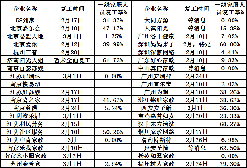江苏的13家家政服务企业,已有2家已开工,大部分企业准备复工,5家企业计划3月初疫情好转后开工,其中苏州金管家保姆为4227人,计划3月1日复工,复工率仅为2.84%。