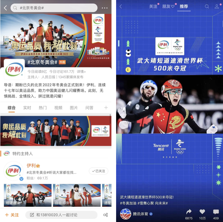 在电视台与网络视频的赛事直播中,伊利围绕运动员高光时刻进行回顾,全面覆盖109个夺金点与15块中国奖牌时刻,全程570次露出。同时,还利用微博与抖音等平台的社交属性,通过互动、挑战赛、小活动等营销方式,进行大胆的创新,让全民参与到冬奥会中,并在赛期与他们持续同频、持续沟通。