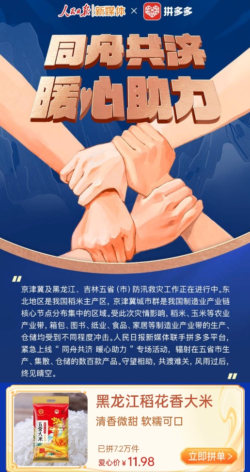 此后,为帮助受灾地区商家减少损失,拼多多相继推出了“加油涿州”图书专场活动与“同舟共济 暖心助力”帮扶专场活动,号召全国网友拼一单。通过在活动专场内设置“加油河北”“加油东北”与“加油京津冀”等专区,重点推介各地区的产业带好物,并给予流量倾斜,帮助受灾地区商家减轻因水灾带来的生产和仓储损失,加速复工复产。