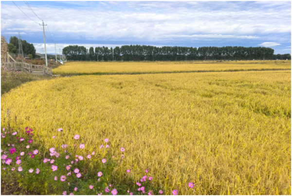 在内蒙古乌兰浩特市敖包山稻田公园,微风拂过成熟的稻穗,金色的波浪翻滚起丰收的喜悦。(摄影:刘文静)