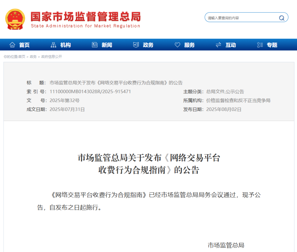 市场监管总局关于发布《网络交易平台收费行为合规指南》的公告