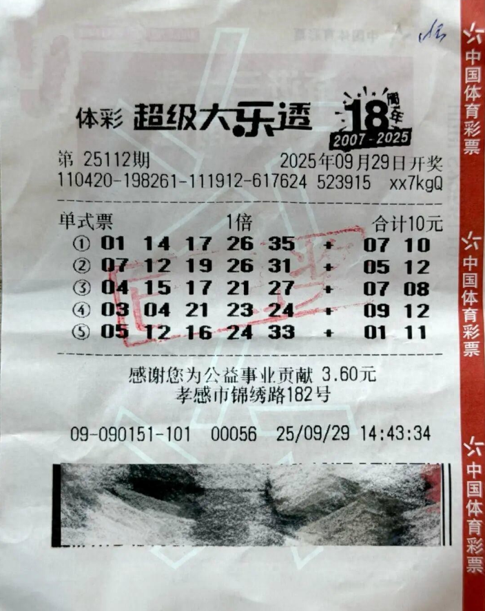 9月29日,超级大乐透第25112期开奖,当期开奖号码前区为03、04、21、23、24,后区为 09、12。全国共开出7注一等奖(1注追加),分别出自福建、天津、山西、江苏、湖北、贵州、陕西。湖北孝感90151体彩销售点售出的一张10元5注单式票命中当期一等奖1注,单票奖金1000万元。