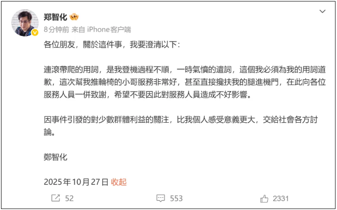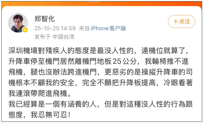 10月25日下午,歌手@郑智化 在微博发文,称深圳机场对残疾人的态度没人性,升降车离机门地板25公分,他的轮椅推不进飞机,腿也跨不进机舱门,操纵升降车的司机完全不愿把升降板提高,冷眼看着他连滚带爬进飞机。