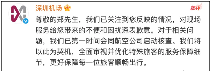 尊敬的郑先生,我们已关注到您反映的情况,对现场服务给您带来的不便和困扰深表歉意。对于相关问题,我们已第一时间会同航空公司启动核查。我们将以此为契机,全面审视并优化特殊旅客的服务保障细节,更好保障每一位旅客顺畅出行。