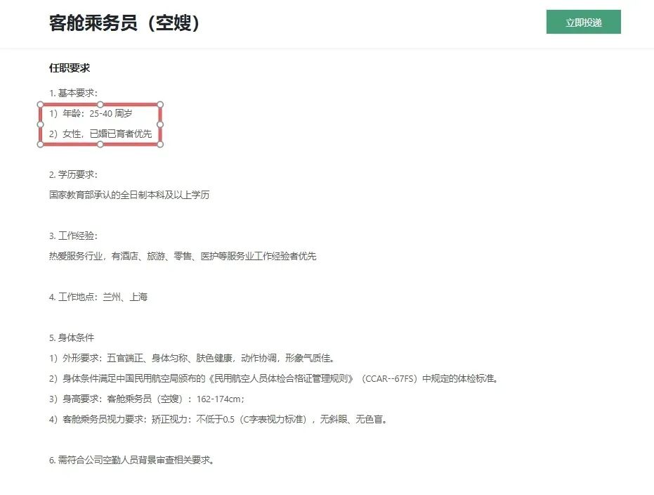 公开信息显示,此前的空姐招聘通常在18-25周岁,部分航空公司放宽至28-32周岁。10月中下旬,首都航空发布的招聘信息显示,乘务长及以上人员可放宽至35周岁。