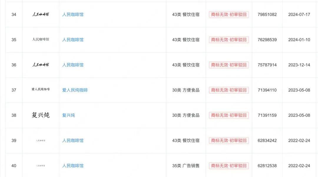 企查查数据显示,要潮文化的咖啡店名起初为“THE PEOPLE”,自2022年起先后多次申请“人民咖啡馆”商标,均被驳回,目前仅持有“潮人民咖啡馆”“要潮人民咖啡馆”两个注册商标。但记者查询其多家直营店门面图片发现,并没有“潮”和“要潮”的字样展示出来,各门店均为“人民咖啡馆”样式的招牌。