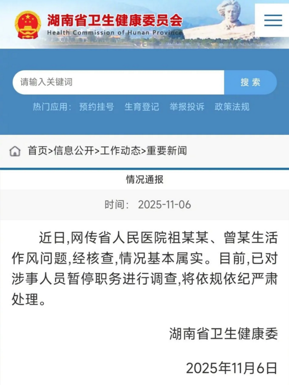 近日,网传省人民医院祖某某、曾某生活作风问题,经核查,情况基本属实。目前,已对涉事人员暂停职务进行调查,将依规依纪严肃处理。