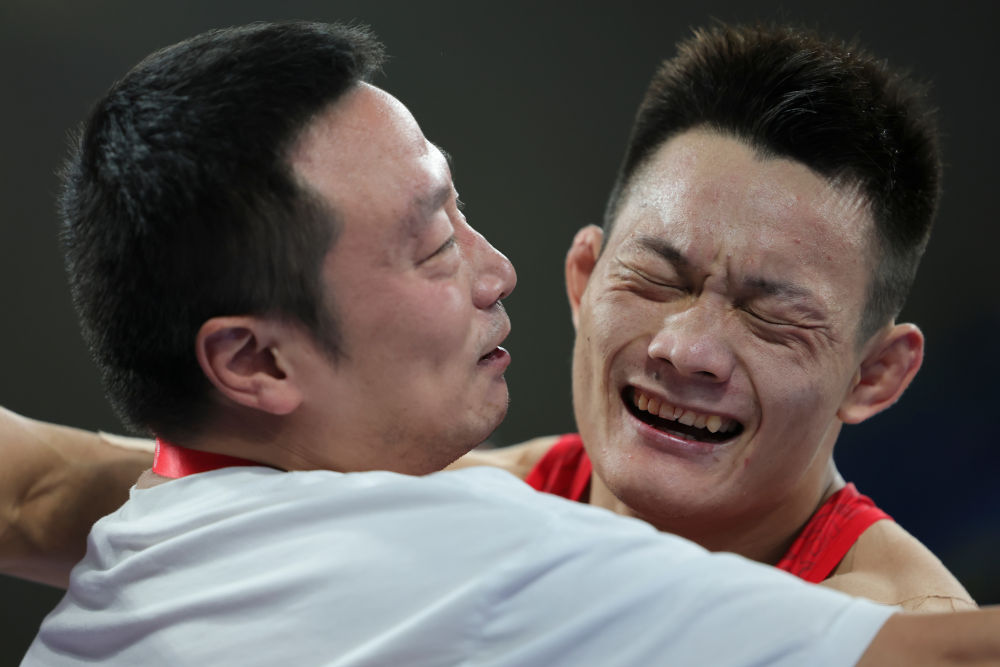 11月12日,江西队选手黎磊(右)在摔跤男子古典式67公斤级比赛后庆祝夺冠。