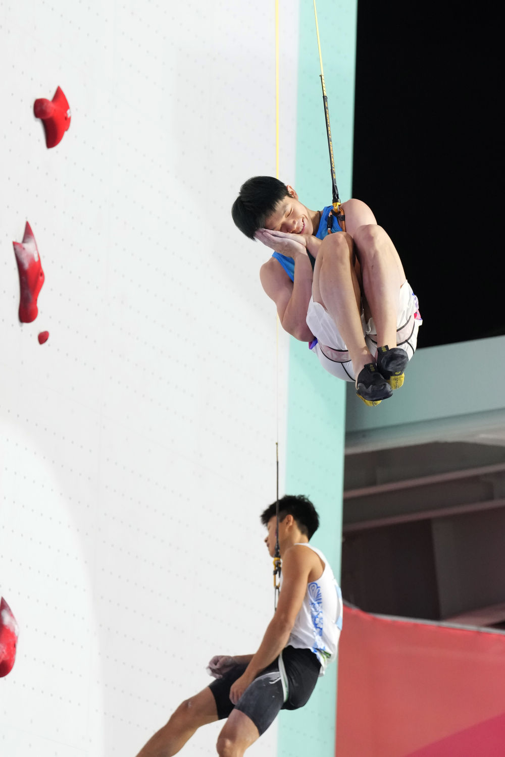 11月14日,上海队选手赵一程(上)和江西队选手黄敬杰在攀岩项目男子速度金牌决赛后。