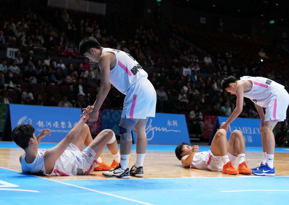 11月18日,浙江队球员欧懿远(左一)、沈唐铭(左三)在篮球项目男子18岁以下组铜牌赛中摔倒。