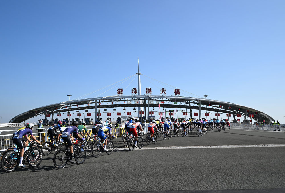 11月8日,在公路自行车男子个人赛决赛中,参赛选手经过港珠澳大桥闸口。