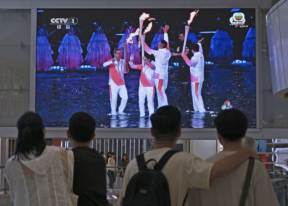 11月9日,香港市民在一家商场内观看第十五届全国运动会开幕式直播。