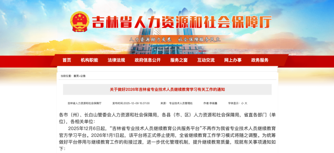 2025年12月6日起,“吉林省专业技术人员继续教育公共服务平台”不再作为我省专业技术人员继续教育官方学习平台。2026年1月1日起,该平台将正式停止使用,全省继续教育工作学习模式将随之调整。为统筹做好平台停用与继续教育工作的衔接过渡,进一步优化管理机制,提升继续教育质量,现就有关事项通知如下: