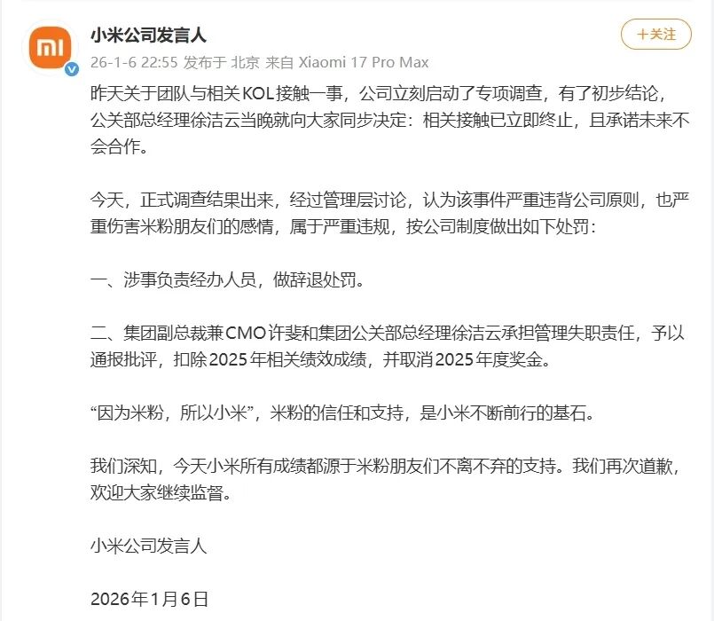 1月5日晚,徐洁云在社交平台发文称,“经过仔细的调查确认,我们的团队此前确实跟相关KOL有过接触。经大家提醒,经过查证,我们立即终止可能进行的任何形式的合作,且以后也不会合作。用户、米粉朋友们的感受,的确是我们最在乎的事情。实在抱歉,给大家带来很多的困扰和不适。”