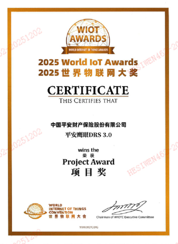 近日,首届全球万物智联数字经济可持续发展大会暨2025(第十届)世界物联网大会在北京成功召开,会上发布了2025世界物联网大奖榜单,平安产险“平安鹰眼DRS3.0”项目凭借物联网技术与地球信息科学、人工智能的深度创新融合,荣获“2025世界物联网大奖-创新项目奖”。这是该奖项设立以来首个获此殊荣的金融机构,标志着平安产险在物联网领域的创新实力与全球竞争力获得国际权威机构的高度认可,同时也为全球产业数字化转型提供了具有标杆意义的“平安方案”。