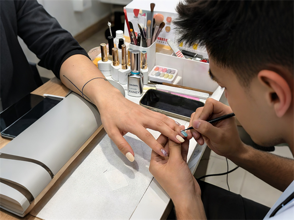 男员工试色新款甲油胶产品