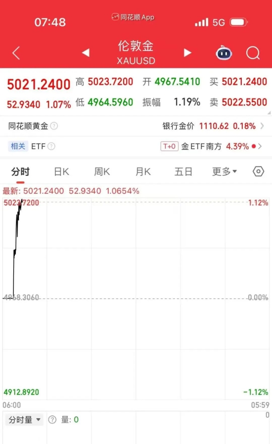 2月5日,现货黄金向上涨回5000美元/盎司,现报5021.24美元/盎司,日内涨超1%。