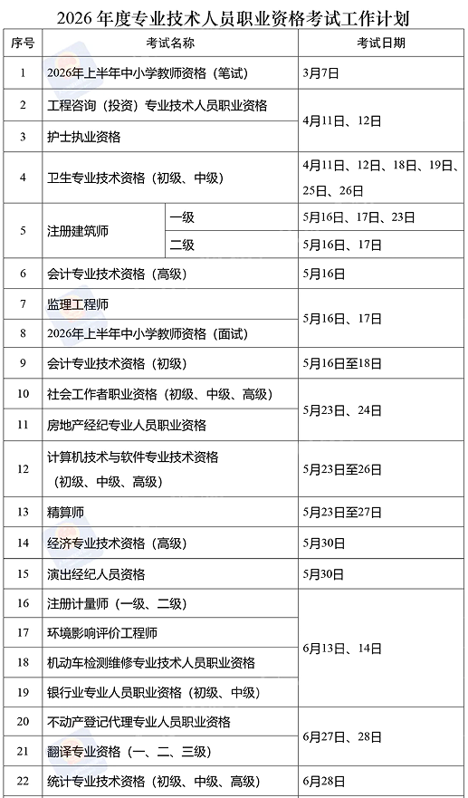 近日,人力资源社会保障部办公厅印发《关于2026年度专业技术人员职业资格考试工作计划及有关事项的通知》。