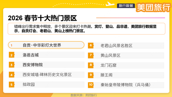 随着节中出游需求释放,多个景区迎来打卡热潮。美团旅行数据显示,自贡·中华彩灯大世界、洛邑古城、西安博物院、西安城墙·碑林历史文化景区、拙政园、老君山风景名胜区、黄山风景区、龙门石窟、滕王阁、秦始皇帝陵博物院(兵马俑)等成为春节假日期间最受欢迎的景区。