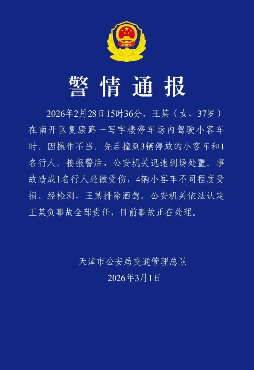 2026年2月28日15时36分,王某(女,37岁)在南开区复康路一写字楼停车场内驾驶小客车时,因操作不当,先后撞到3辆停放的小客车和1名行人。接报警后,公安机关迅速到场处置。事故造成1名行人轻微受伤,4辆小客车不同程度受损。经检测,王某排除酒驾。公安机关依法认定王某负事故全部责任,目前事故正在处理。