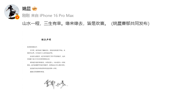 3月16日下午,知名演员姚晨与曹郁发布联合声明,官宣俩人已经离婚。联合声明称:多年前,我们结束了婚姻关系,考虑到当时孩子年幼,未做对外公布。