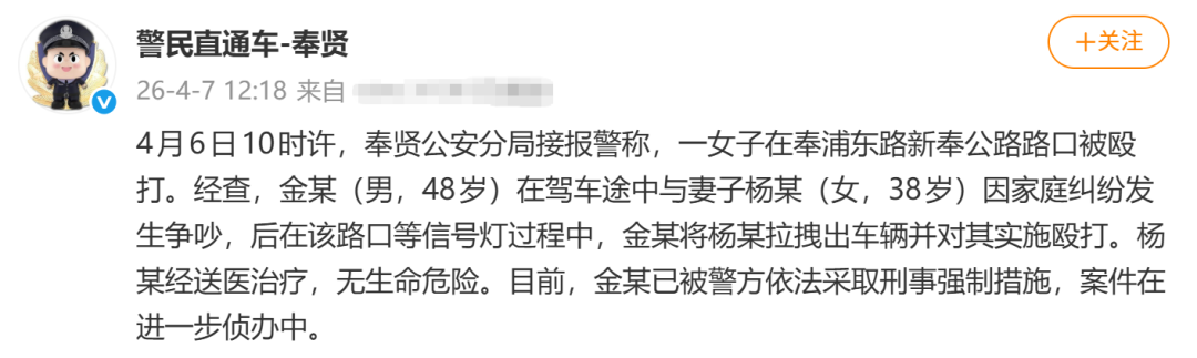 4月6日10时许,奉贤公安分局接报警称,一女子在奉浦东路新奉公路路口被殴打。经查,金某(男,48岁)在驾车途中与妻子杨某(女,38岁)因家庭纠纷发生争吵,后在该路口等信号灯过程中,金某将杨某拉拽出车辆并对其实施殴打。杨某经送医治疗,无生命危险。目前,金某已被警方依法采取刑事强制措施,案件在进一步侦办中。