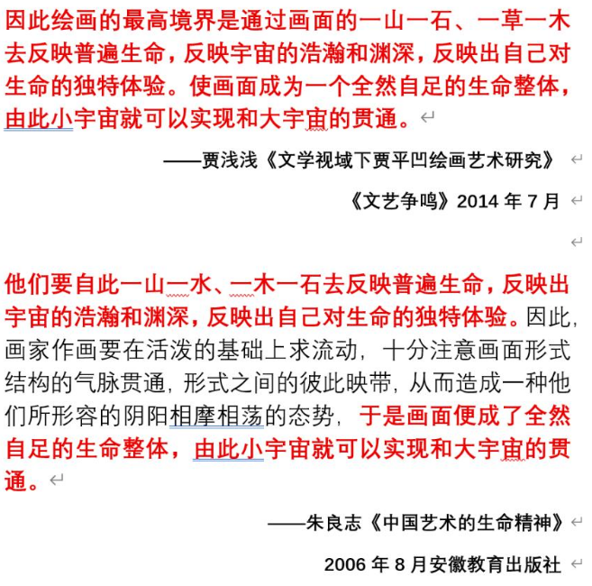 此外,贾浅浅文章开篇对中国绘画“三阶段论”的论述,其整体框架、逻辑推演及所引古人语句,与作家韩羽2008年12月发表于《美文》杂志的文章高度一致。在关于“文画关系”、“题跋艺术”等部分的论述中,从独特的个人化比喻(如“语言的磨刀石”)到具体的论证过程,二者也呈现出雷同之处,亦未标注引用文献。