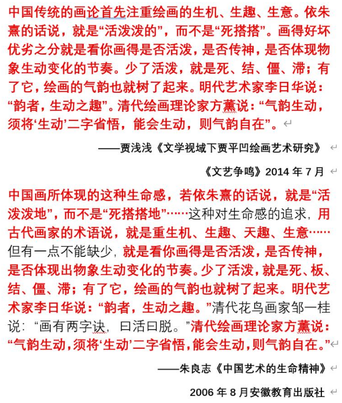 “抒情的森林”发现,贾浅浅将学者朱良志在2006年《中国艺术的生命精神》中关于中国画普遍理论的核心观点移用于《文学视阈下贾平凹绘画艺术研究》一文,评价其父亲贾平凹绘画作品“气韵生动”。