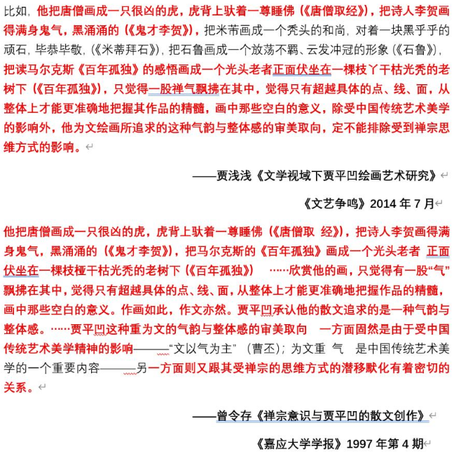 “抒情的森林”还发现,贾浅浅论文中关于贾平凹画作《唐僧取经》《鬼才李贺》《百年孤独》等作品的描述,与学者曾令存1997年发表的《禅宗意识与贾平凹的散文创作》一文的文本存在大面积重叠。不仅画作名称、具体意象描述,如“黑涌涌的”、“光头老者”等语句雷同,其关于贾平凹绘画“追求气韵与整体感”、“受禅宗思维影响”的核心观点及完整论述段落也近乎一致,且未标注引用文献。